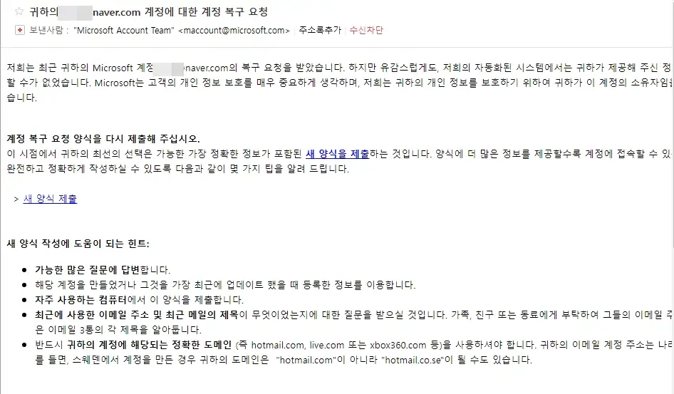 더 당황스러운 일이 발생했습니다. 마이크로소프트 계정으로 사용한 네이버 메일로 어떤이가 다음과 같은 메일을 보냈네요.