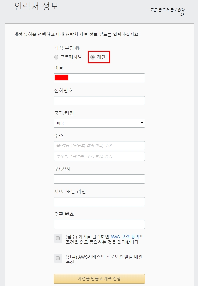 다음에 나타난 화면에서 계정유형을 일반 개인 유저라면 “개인”으로 선택을 해줍니다. (추후에 변경 가능합니다.) 전화번호와 국가, 주소, 우편번호를 입력해주고 필수 조건에 체크 한후에 “계정을 만들고 계속 진행” 버튼을 눌러줍니다. 주소는 영문으로 입력해 줍니다.