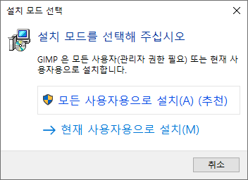 설치 파일을 실행하면 위와 같이 설치모드를 선택하라고 나온다. 일단 “모든 사용자용으로 설치”를 누른다.